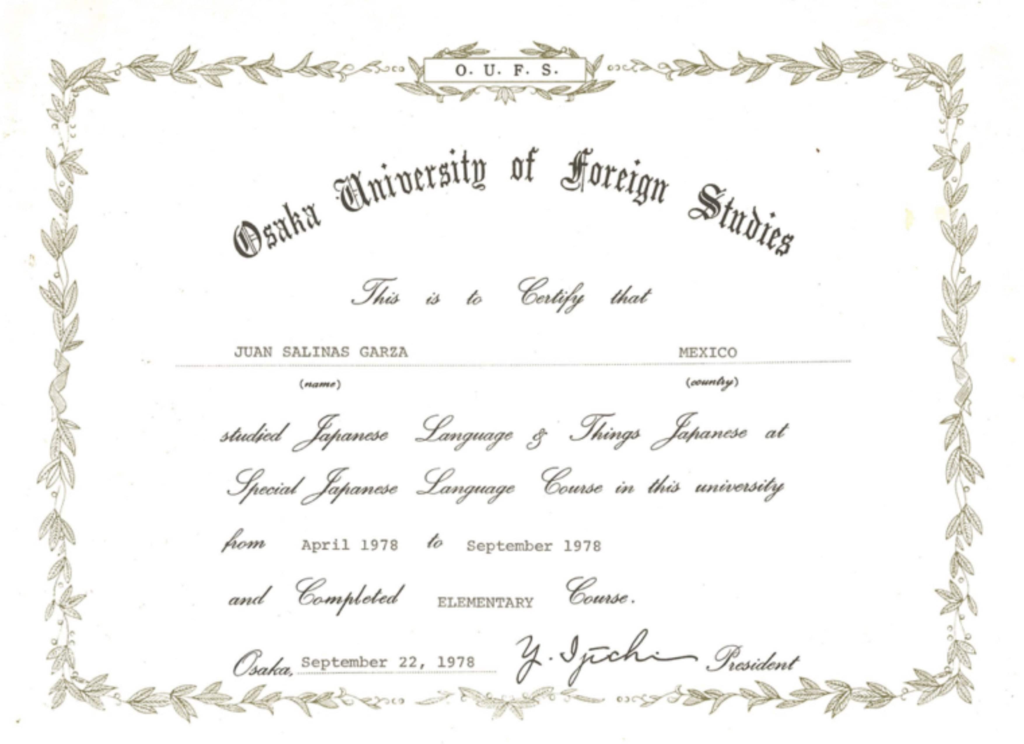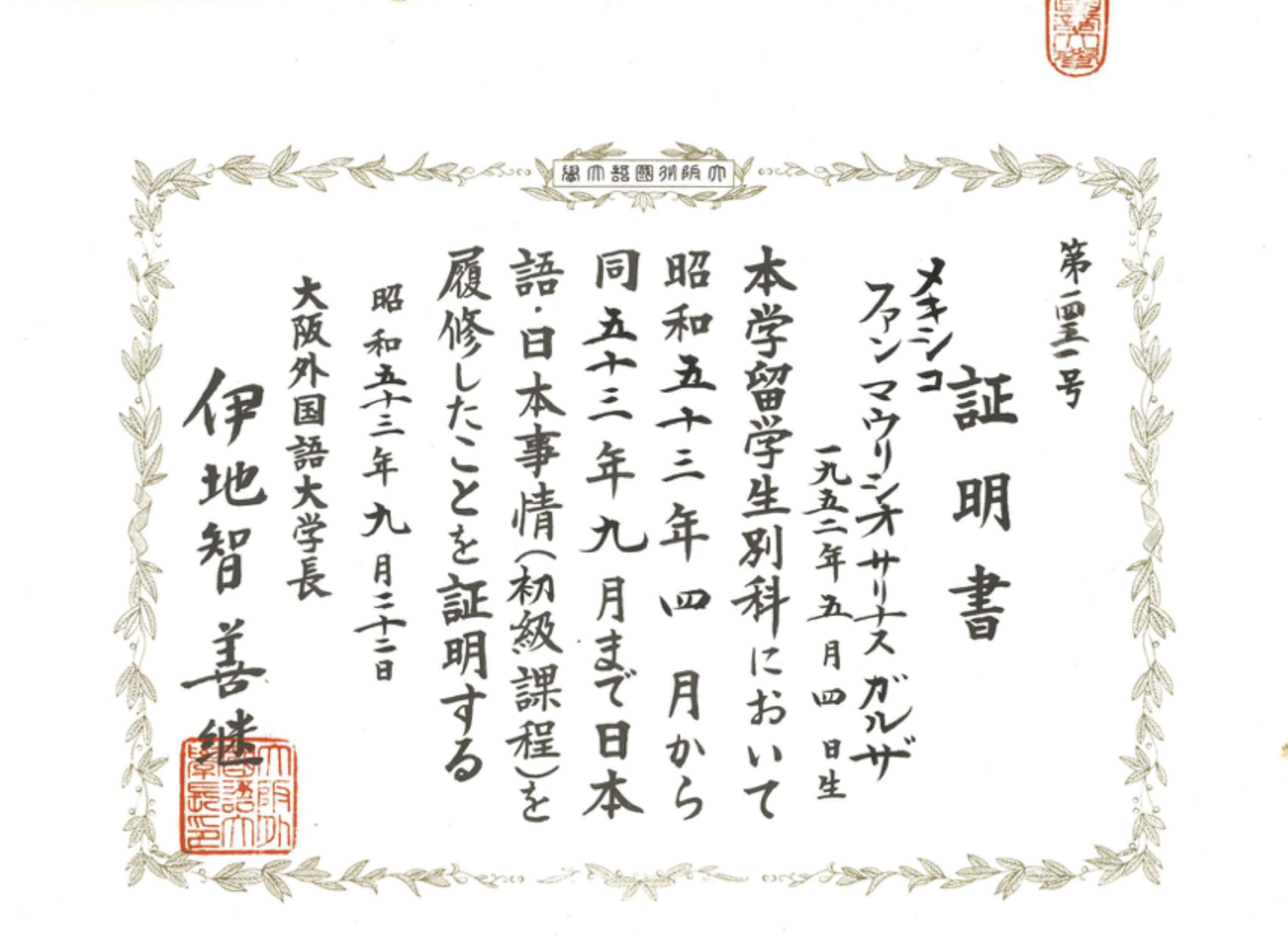 Título en Japonés por la acreditación de estudio del Idioma Japonés impartido en la Universidad de Osaka, Jampón.