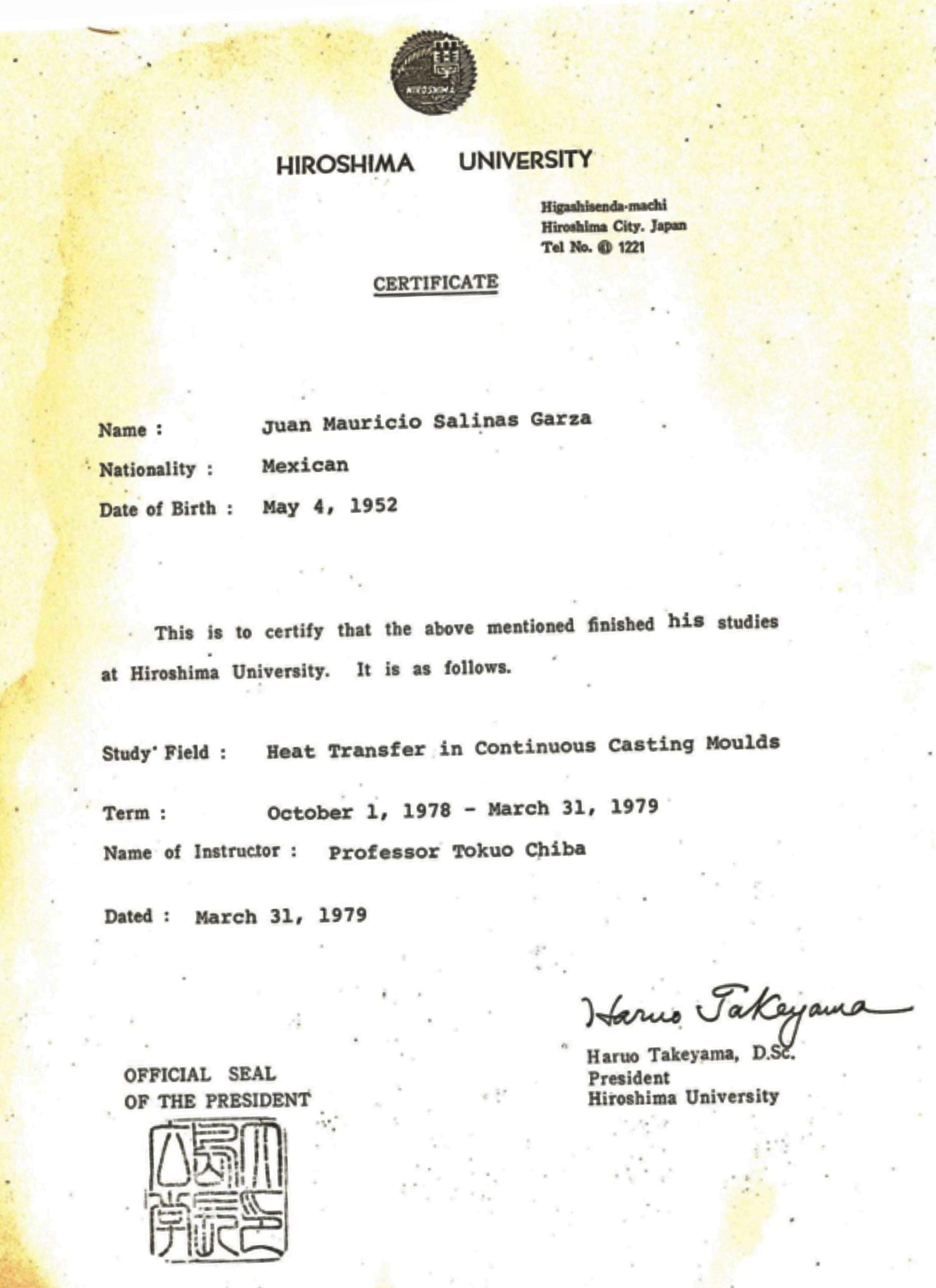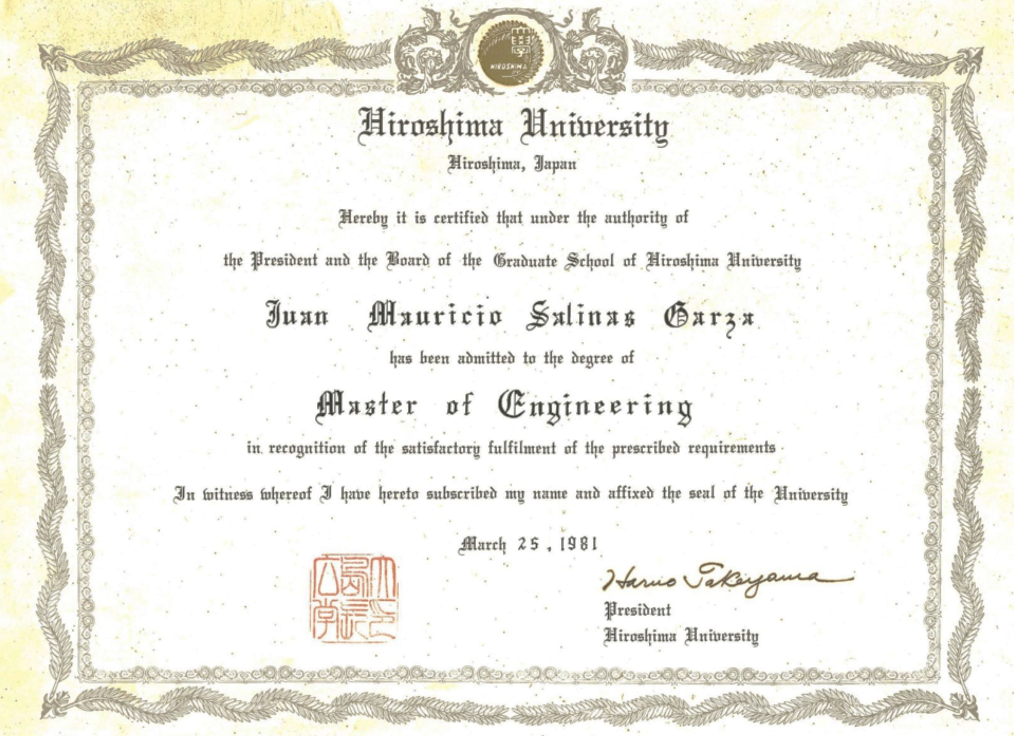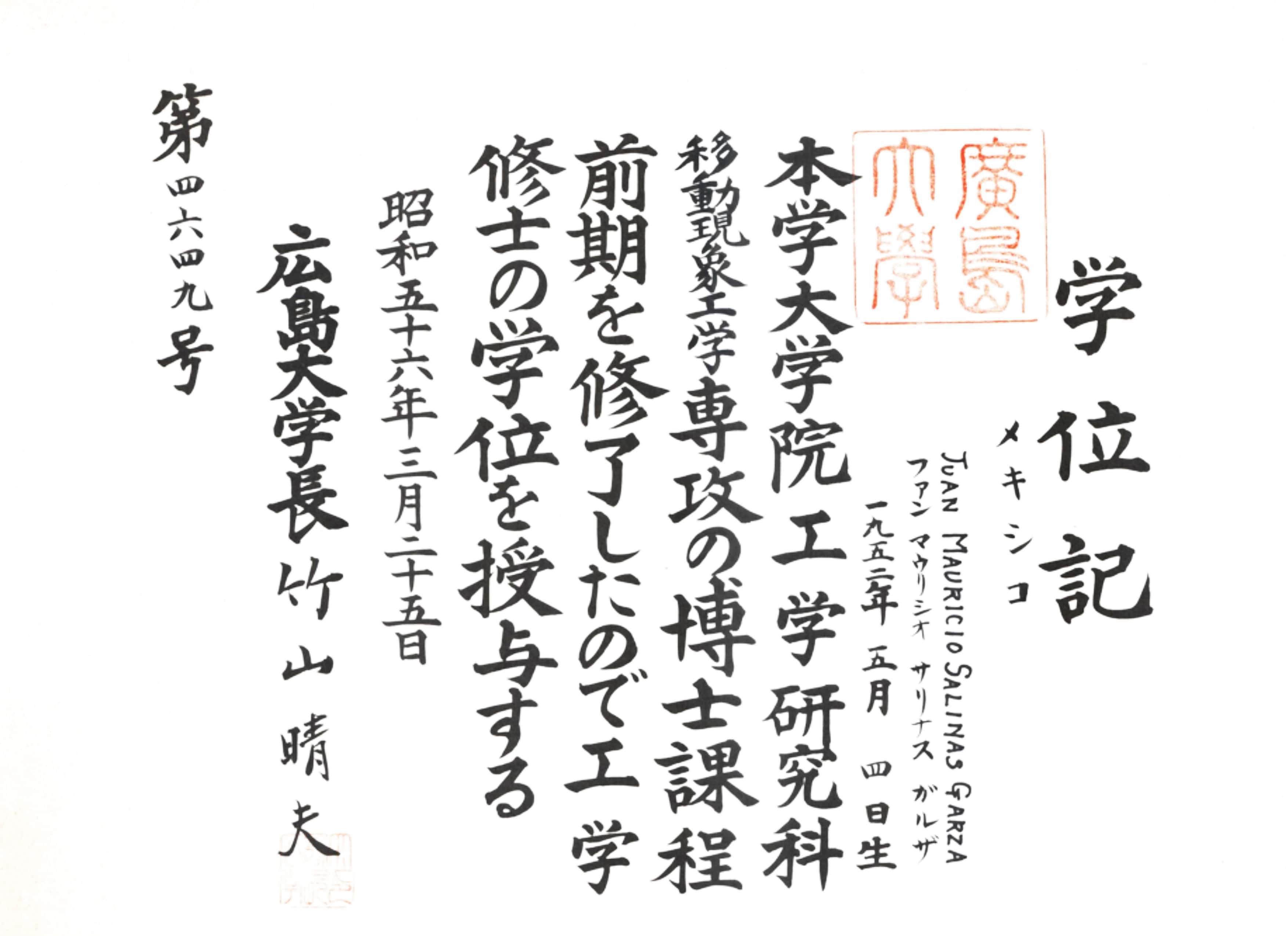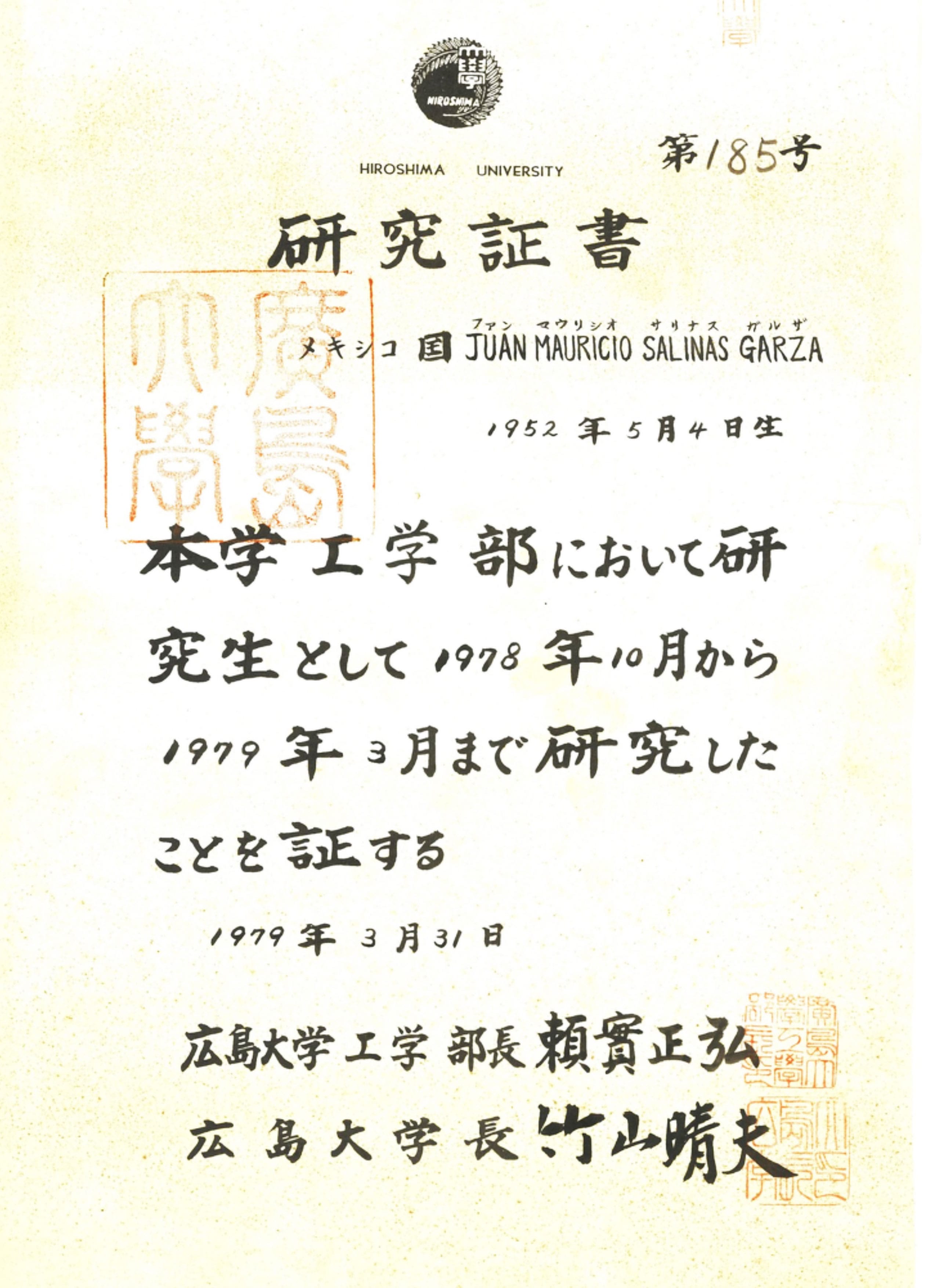 Certificado en Japonés por el termino de la Maestría en Ingeniería en Universidad de Hiroshima