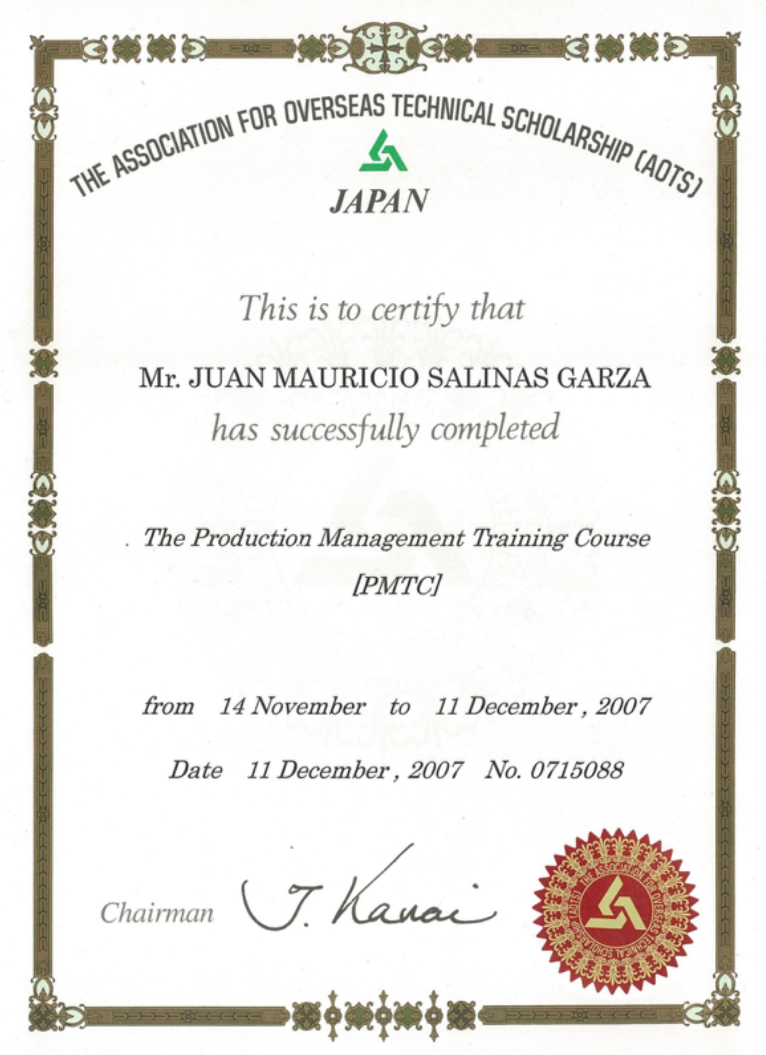 Certificado Administración de la Producción, Ciudad Toyota, Japón. (AOTS)